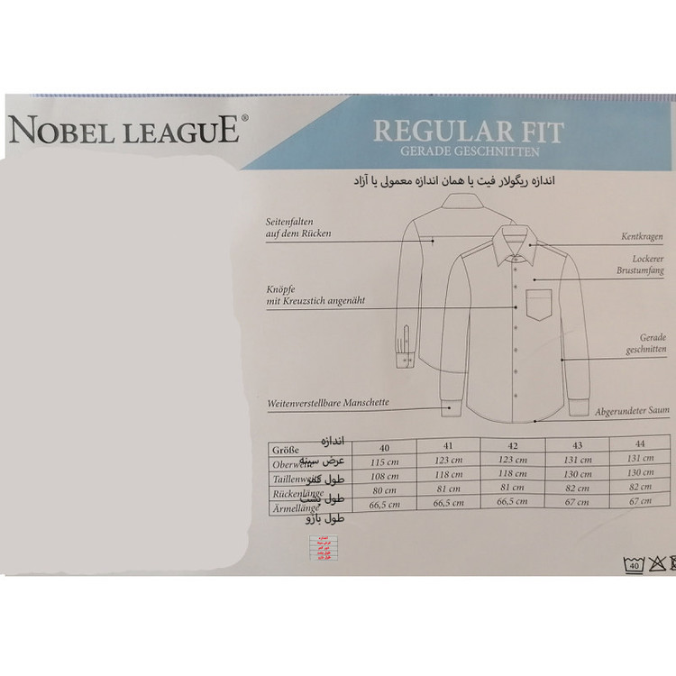 پیراهن مردانه نوبل لیگ سایز ریگولار یا همان آزاد از 100 درصد نخ تولید شده است و مناسب افراد چاق و آزاد پوش می باشد . لطفا در انتخاب سایز دقت بفرمایید ... شما می توانید جدول سایزبندی را به همراه اندازه های کمر و سینه و بازو را در قسمت عکس ها مشاهد بفرمایید . این برند نوبل لیگ یکی از زیرشاخه های برند لیدل آلمان است که به طور اختصاصی انواع لباس مردانه تولید می کند. این برند شامل همه لباس های مردانه می شود به عبارتی تنوع محصولات در کنار کیفیت فوق العاده آن، محبوبیت این برند را جهانی ساخته است. تنوع رنگ و طرح و کیفیت فوق العاده در لباس های مردانه برند نوبل لیگ و تولید در سه مرحله ریگولار ( آزاد ) اسلیم فیت ( جذب ) سوپر اسلیم فیت ( خیلی جذب ) از امتیازات این برند محسوب می شود. محصولات این برند برای هر نوع سلیقه ای مناسب هستند و قابلیت ست شدن با انواع استایل های رسمی و غیررسمی را دارند.