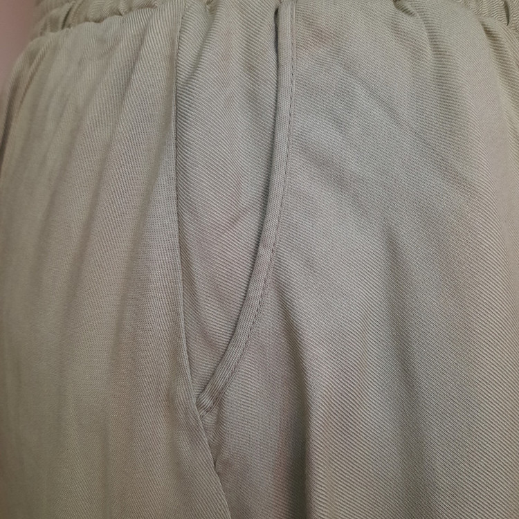 دو تا جیب دارد استر دارد سایز 42_44 قد دامن از جلوی لباس 47 و پشت لباس 54 عرض کمر دامن بدون کشسانی 48 و با کشسانی 58