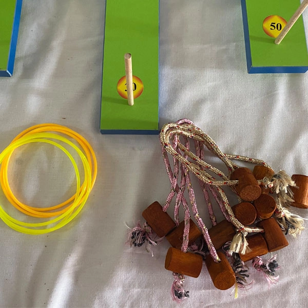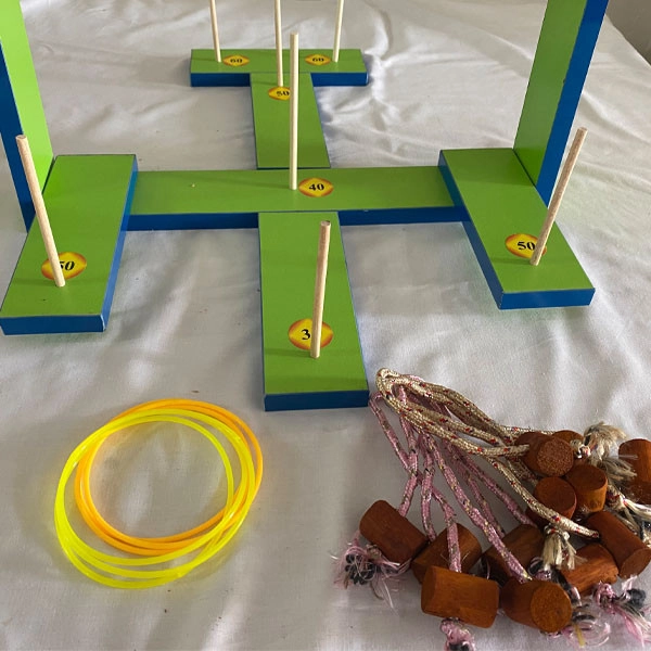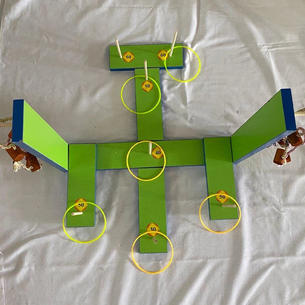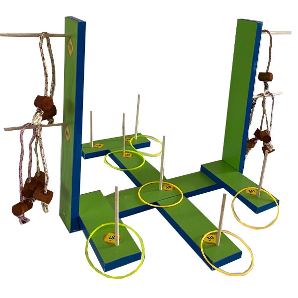 -قطعات چوبی -میخ های چوبی -میله های چوبی - طناب با مهره 6 عدد - حلقه در دو رنگ 6 عدد - راهنمای بازی