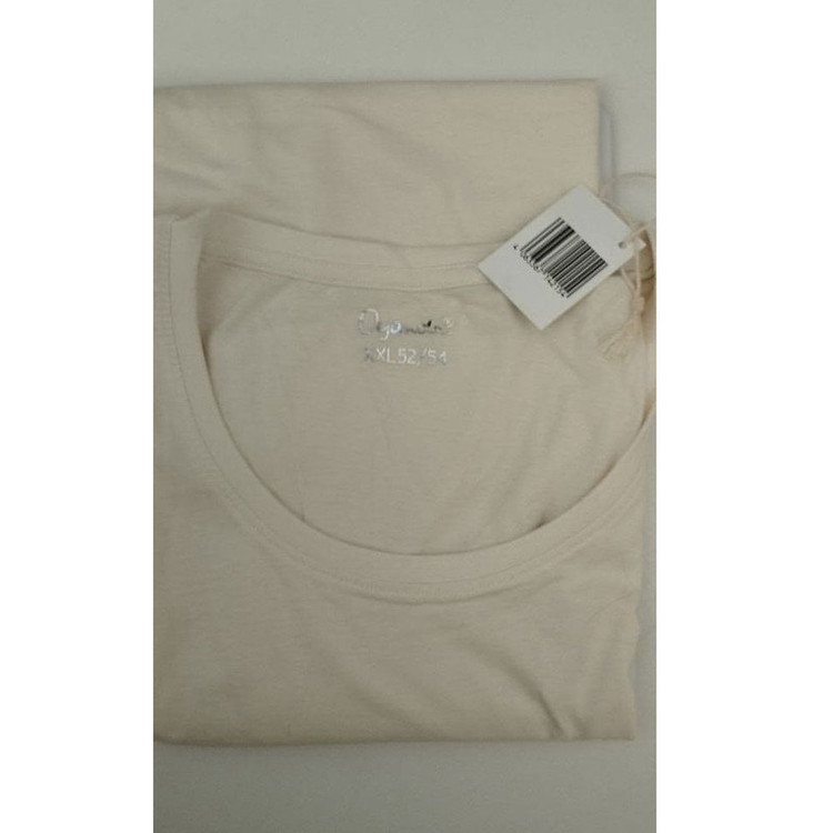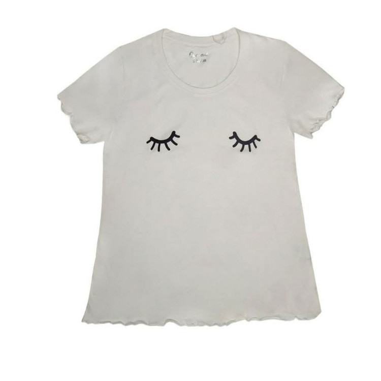 تیشرت زنانه اویاندا رنگ کرم قد کار تا روی باسن یقه گرد استین کوتاه لبه استین وپایین لباس چین داره طرح مژه