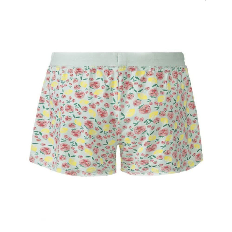 تیشرت زنانه اسمارا رنگ سبز طرح چاپ استین گوتاه یقه گرد قد کار تا روی باسن شلوارگ رنگ سبز طرح میوه کمر کار کش داری لند تنظیم کننده قد کار تا روی باسن